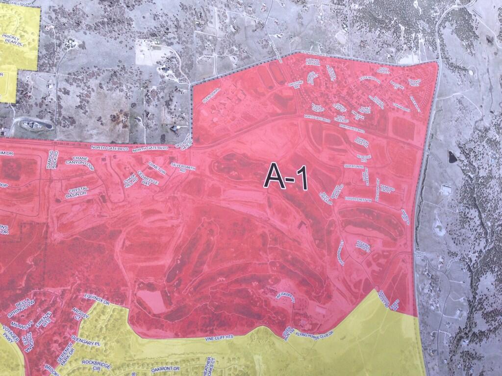 Mandatory Evacuation Area A-1:  Northern Boundary: North Gate and Old North Gate Road - Southern Boundary: Flying Horse Club Drive (to include homes south of Flying Horse Club Drive on Barossa Valley Road and Veneto Way)/Vine Cliff Heights/Equinox Drive/Serenity Peak Drive - Eastern Boundary: Highway 83 - Western Boundary: Voyager Parkway