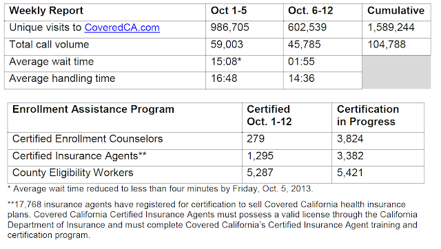 For the first two weeks of open enrollment, more than 1.5 million unique visits were made towww.CoveredCA.com. The Service Center has handled more than 100,000 calls during the same period. From Oct. 1 through Oct. 12, more than approximately 94,500 applications were started.